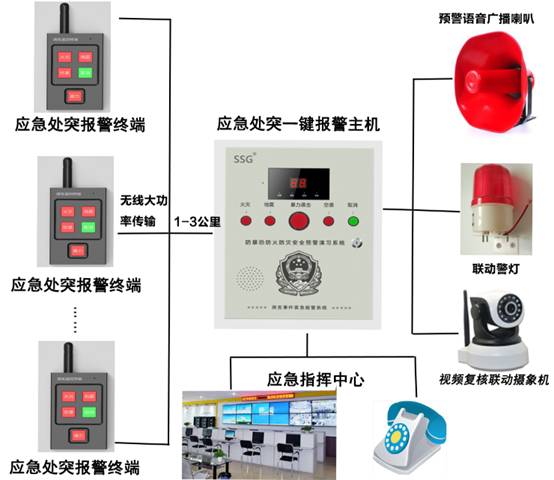 遇到突发事件时按动相应的警情按钮,警报便会响彻安装此设备的场所,告知人们突发事件来临,人们便可根据警报声提示采取相应的自救自护措施,同时辖区派出第一时间了解突发警情种类,按照警情类型合理安排人员出动,从而提高办事效率,快速出警。